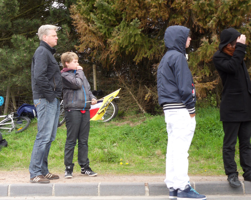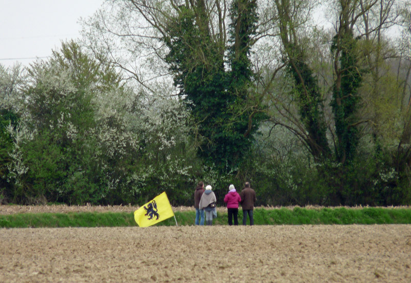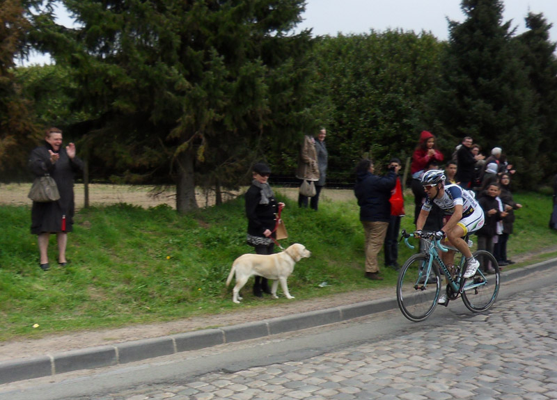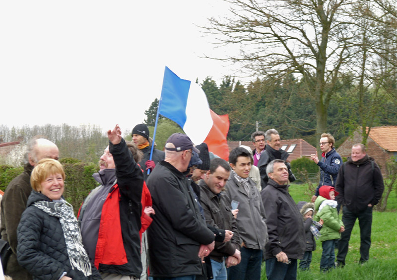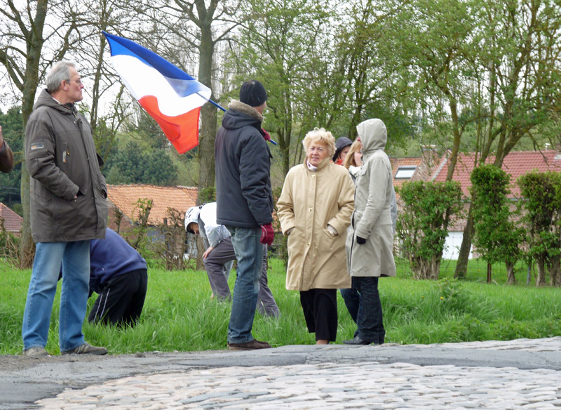 Les regard sont tournés vers le bout de la route et les passages successifs de motards et de voitures suiveuses suscitent à chaque fois espoirs vite détrompés. L’habitué sait bien que le véritable signal de l’approche de la course est l’hélicoptère. Tant que vous n’entendez pas le vrombissement de ses rotors ou ne l’apercevez, si le vent porte dans sa direction, inutile de se tordre le cou pour tenter de distinguer le ou les premiers. Soudain le voilà, survolant la route à basse altitude, chacun le montre du doigt, au loin les phares des voitures confirment la position de la tête de course. Enfin on aperçoit dans l’axe du tronçon, Tom Boonen qui a distancé ses adversaires. Il avance vite le bougre, trop vite pour le zoom de mon appareil photo, j’opte pour le grand angle espérant le saisir quand il passera devant moi. Las, une erreur de manipulation m’aura fait activer le retardateur de prise de vue.