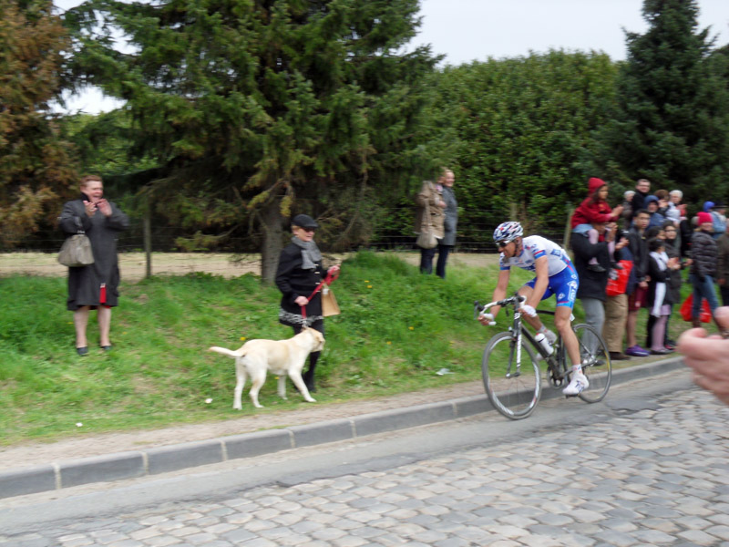 15h00, le repas dominical et pascal touche à sa fin, je m’éclipse discrètement et vais voir sur France 3 où en sont les coureurs. La tête de course n’est plus qu’à une quarantaine de kilomètres de l’arrivée. Vu le train mené, il ne faut plus trop tarder. De retour dans la salle à manger quelqu’un évoque fort opportunément Paris Roubaix et ma femme de remarquer que je vais être privé de course. La transition est toute trouvée pour annoncer que non, non, n’ayant pas été sollicité à cette heure je ne prends pas trop de risque à m’éloigner du domicile et que je compte bien aller sur le bord du parcours.