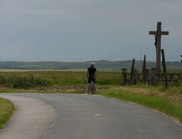 Je repars pour trente cinq kilomètres avant le prochain ravitaillement. Le profil altimétrique change rapidement alors que nous avons le vent de face. A rouler seul, ma moyenne s’en ressent. J’ai du mal à trouver une position confortable et arrive à Blerquin m’interrogeant sur ma capacité à terminer l’étape compte tenu de la dernière partie, qui s’annonce plus corsée.