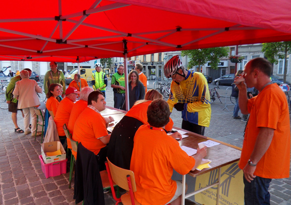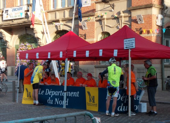 Départ de Lille vers Orchies à 5h30. Enfin un temps estival qui permet de partir aux petites heures en maillot. Le vent de face annoncé n’était pas aussi prononcé que je le craignais et j’arrive sur la place de la Mairie bien à l’avance. Les banques d’accueil sont largement dotées en bénévoles et les inscriptions sont fluides et rapides.