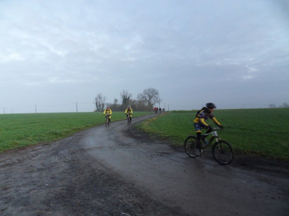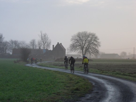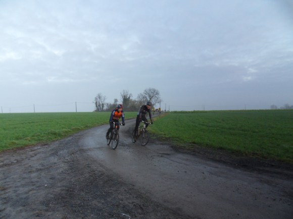 L’arrêt de la pluie depuis trois jours n’a pas suffit au drainage des champs et chemins et ces derniers sont toujours pour certains à l’état de fondrière. Deux premiers tronçons de cette nature permettent de monter en température et en pulsations cardiaques. Après le troisième je serai en nage et enlèverai mon bonnet. Les secteurs pavés qui suivent paraissent par contraste très roulant, quant à la route n’en parlons pas.