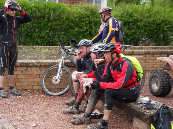 Ravitaillement de Faumont, moins enneigé que pour le Chicon Bike Tour (Cf. les archives de janvier 2013). Les uns se restaurent, d’autres en profitent pour donner des nouvelles.
