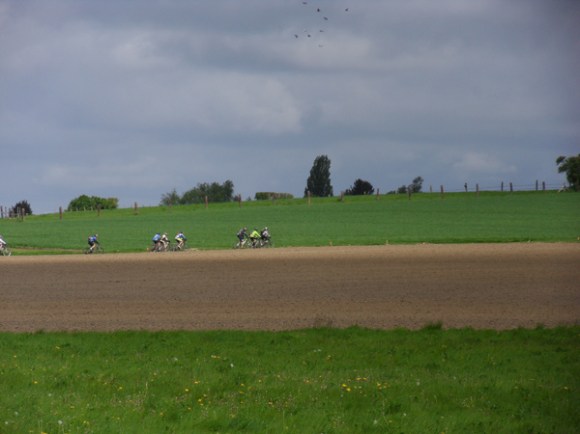 A l’assaut de Mons en Pévèle, alors que se dessine une franche éclaircie. Disposant encore de mes deux mains, je photographie en roulant.