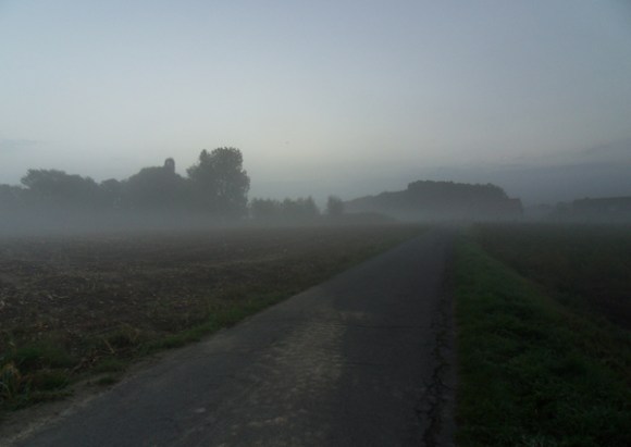 Parti avec gilet jaune et lumières allumées avant que le jour ne se lève, je garderai l’ensemble jusqu’à une heure avancée de la matinée et l’amorce d’une éclaircie, une dizaine de kilomètres avant l’arrivée.