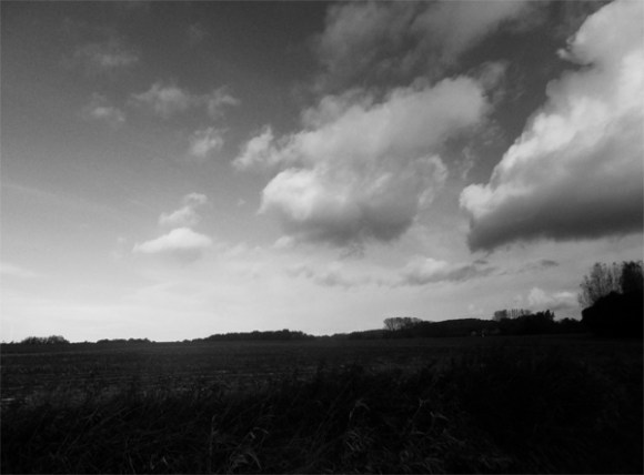 Je prends la direction du Mont Noir, le temps est incertain et que le regard se porte vers la vallée de la Lys ou vers le Mont des Cats, le ciel est anthracite. Quelques bancs de ciel bleu laissent espérer une éclaircie qu’un grain subit repousse. Finalement, la trouée s’élargit et tient à l’écart un plafond dense et bas. Au dessus de ma tête, défilent sur fond de ciel bleu des nuages aux formes et aux teintes changeantes.
