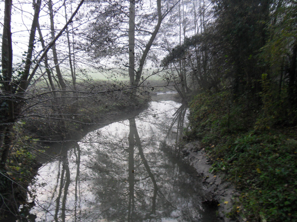 Si une fugace bande de ciel bleu, laissa espérer que nous n’avions à faire qu’à une brumaille de beau temps, cet espoir fut vite déçu. Les premiers villages traversés semblaient tout engourdis. Tout comme les signaleurs placés à l’intersection des routes les plus importantes qui, à cette heure encore matinale, attendaient le chaland et dont un ou deux furent pris un peu au dépourvu par mon arrivée solitaire et ouatée.
