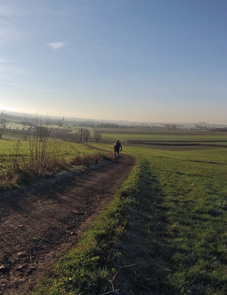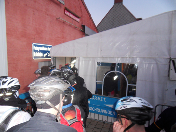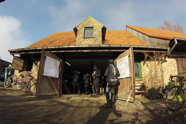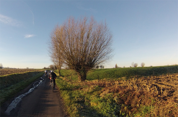 Départ vers Locker en suivant les contreforts du Mont Kemmel, boucle vers Westoutere en passant par le Mont Rouge. Le terrain est gelé par endroits mais de belles portions boueuses subsistent. Les organisateurs ont identifié les plus significatives et les ont numérotées dans l’ordre décroissant. Je n’ai pas prêté trop attention à cette numérotation au début, mais je pense qu’il devait y en avoir entre vingt et vingt-cinq.