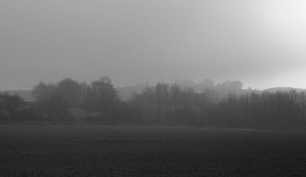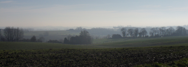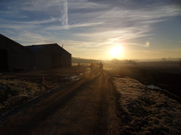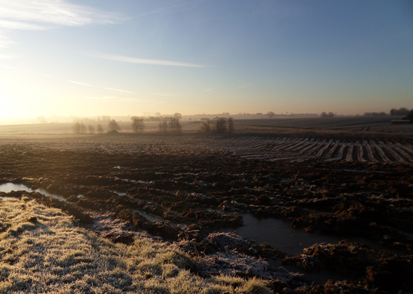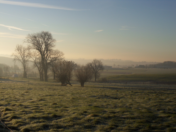 Les gelées nocturnes étaient encore visibles en ce début de matinée, striant de blanc les champs labourés et faisant luire les pâtures et flaques d’eau sous un soleil rasant. La fraicheur matinale et la distance étaient là néanmoins pour refréner la tentation d’arrêts photos trop fréquents.