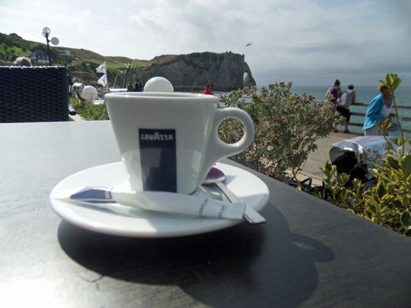 Inutile de s’étendre sur la description d’Etretat. Le ciel très couvert jusque là s’est enfin éclairci et je savourerai en terrasse un café et mon dessert, avec vue sur l’aiguille creuse et les falaises. J’aurais volontiers prolongé cette halte mais il me reste une quarantaine de kilomètres jusqu’au Havre et, redoutant le vent et un relief bosselé, je préfère assurer.