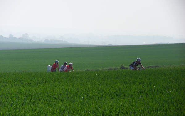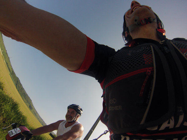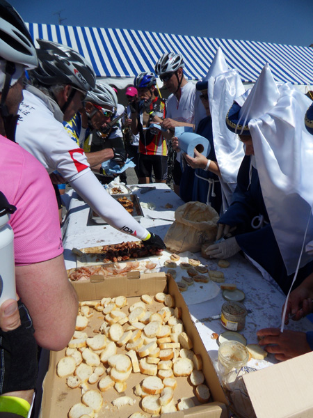 Les lunettes de soleil et l’essuie-tout sont un peu décalés au regard de la tenue, mais cela n’embarrasse pas les cyclos qui se lèchent les babines avec volailles et saucisses grillées.