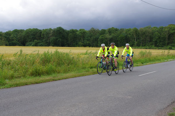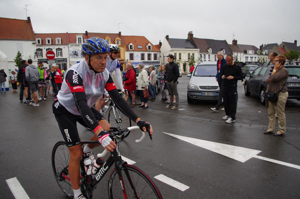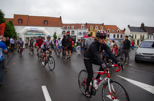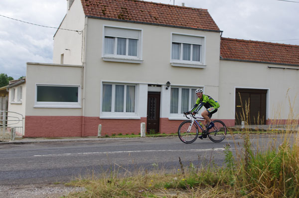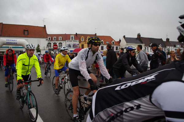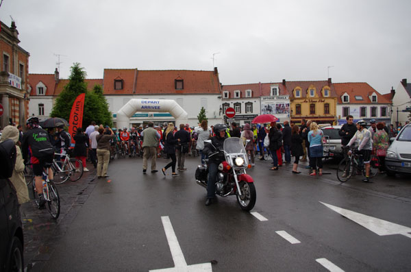 Le ravitaillement de Saint Omer marque la mi-route et la perspective des Monts des Flandres, à moins que ce ne soit le vent favorable, me met en jambes. Un rapide coup d’œil latéral me fait découvrir un horizon anthracite annonceur de précipitations plutôt abondantes. Mais j’ai bon espoir d’y échapper, l’itinéraire nous conduisant à l’opposé.