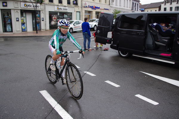 Faible crachin à 7h00 alors qu’affluent les participants, elle s’intensifiera peu après le départ rendant précieux les signaleurs placés aux endroits dangereux.