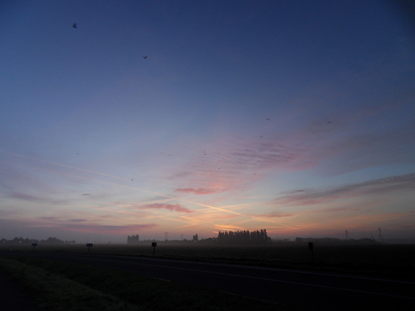 Je ne regrettai pas gants longs, bandeau pour les oreilles et tour de cou au départ vers Provin alors que la nuit était encore bien présente. Je regrettai par contre de n’être toujours passé à l’acte s’agissant de l’acquisition d’un projecteur digne de ce nom, mon éclairage avant se révélant un peu juste par endroits. Je parvins néanmoins à éviter bordures et nids de poules jusqu’à ce qu’une aube opaline vienne éclairer ma route.
