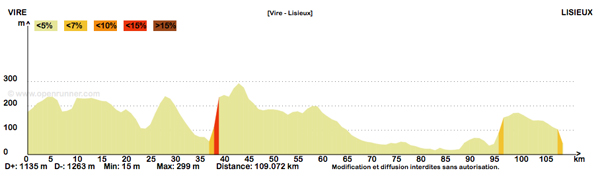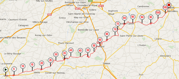 Etape vallonnée entre Vire et Lisieux dans une campagne verdoyante.