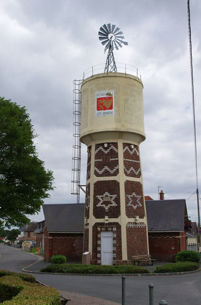 Potigny, cité minière. La château d’eau était destiné à alimenter en eau les habitations des cités minières peu avant la première guerre mondiale. L’éolienne servait à alimenter la pompe. Celle qui figure aujourd’hui est factice.