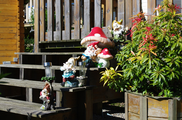 Petit échantillon d’un jardinet peuplé de nains de jardins et autres statuettes.