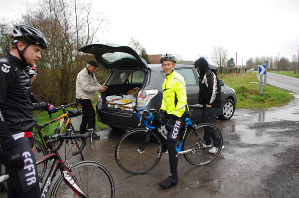 Mons en Pévèle arrive après une grosse vingtaine de kilomètres, lieu de séparation du 60 et du 90 et je continue seul vers Bersée puis Faumont. A la Picterie, point de ravitaillement, seule une voiture stationne dont les occupants sortent me voyant arriver. Les provisions sont au sec dans le coffre. Moins de dix participants sont passés avant moi et un groupe de cinq, arrivant peu après, ferme la marche comme je le constaterai à l’arrivée.