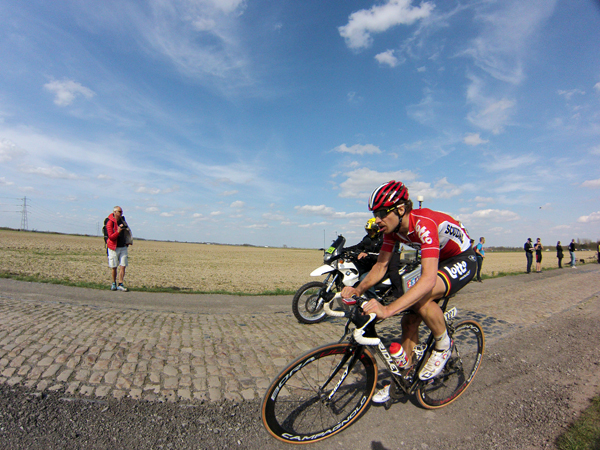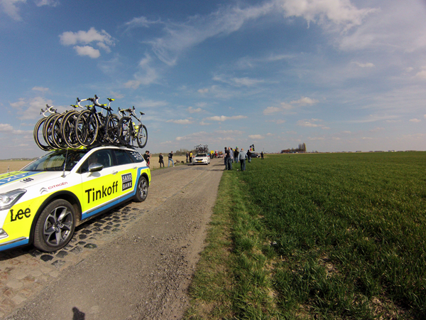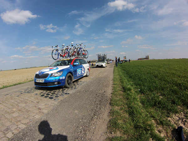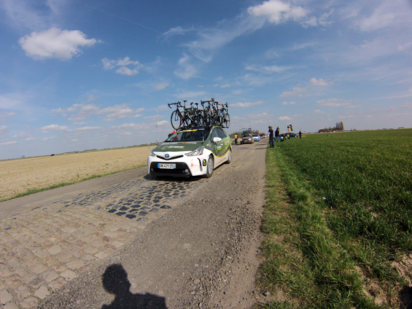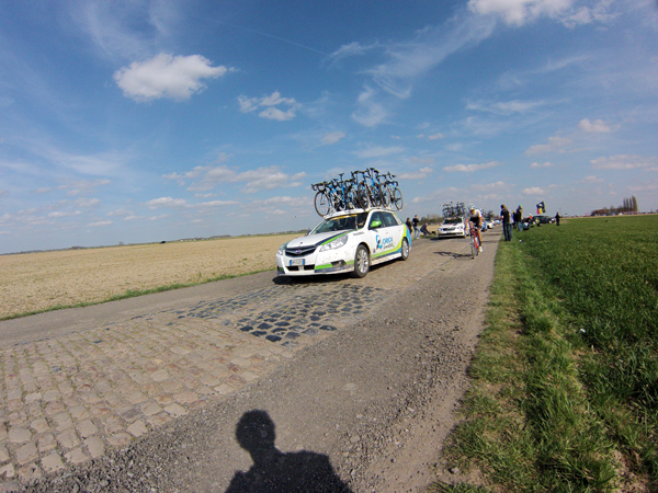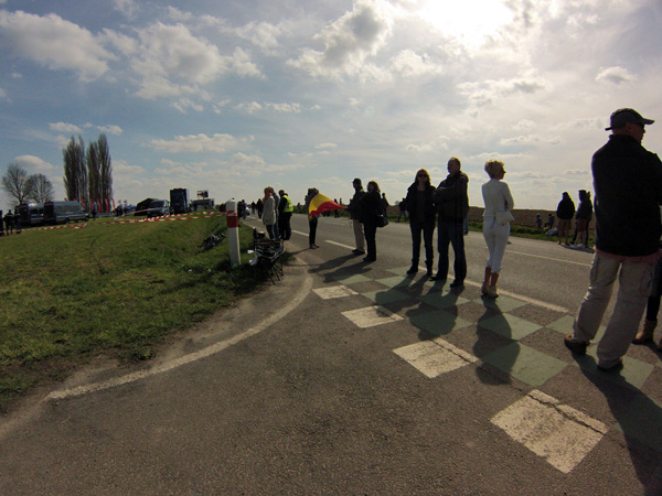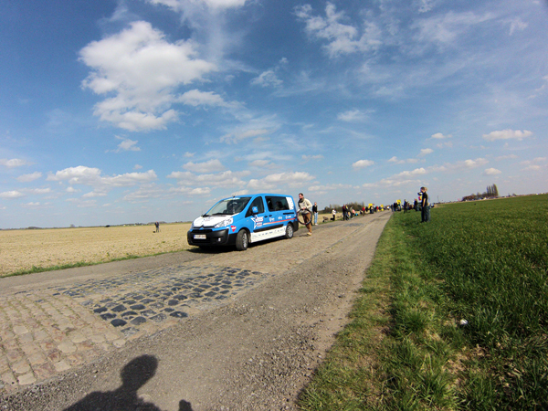 J’avais imaginé un dispositif photographique sophistiqué pour « couvrir » ce Paris Roubaix. En complément des prises de vues faites avec mon reflex, j’avais prévu de monter la gopro sur un bras extensible (dont on se sert pour peindre les plafonds) le dit bras devant être fixé sur le bas côté à l’aide de haubans. Je n’étais pas peu fier de mon installation les haubans étant constitués par des vieux tendeurs de tente, satisfait de pouvoir démontrer ainsi à ma femme que les divers objets pouvant toujours servir et qui de son point de vue encombrent inutilement notre cave finissent par trouver une destination.