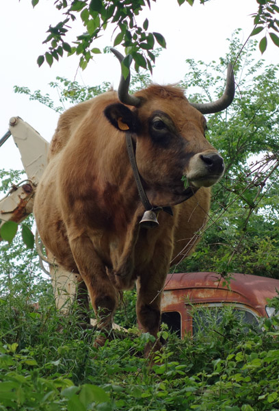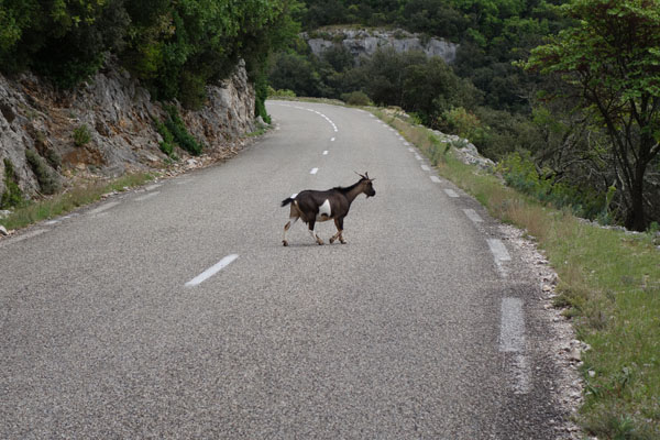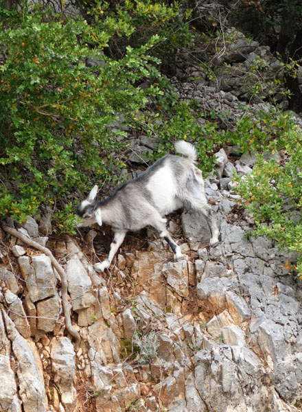 Position de broutage acrobatique. Une raison supplémentaire de porter le casque, les pierres que les chèvres font tomber sur la chaussée.