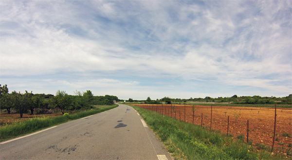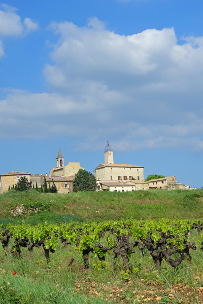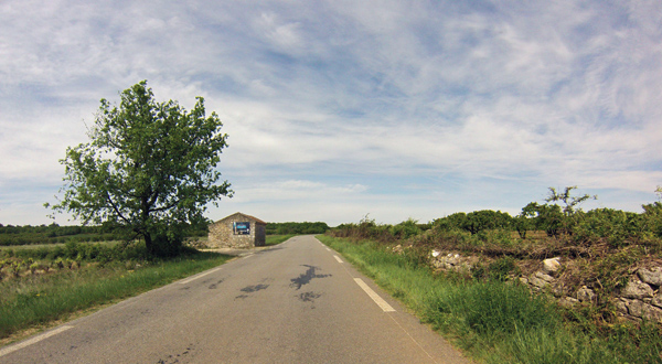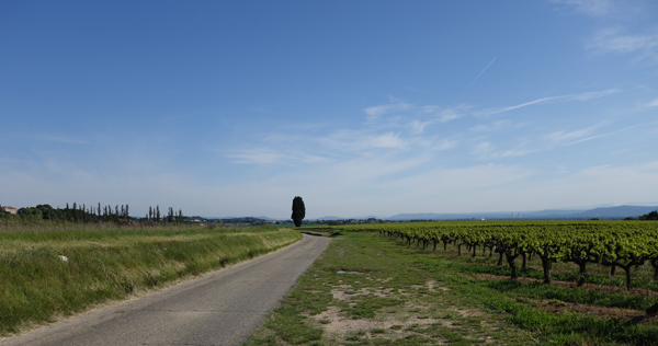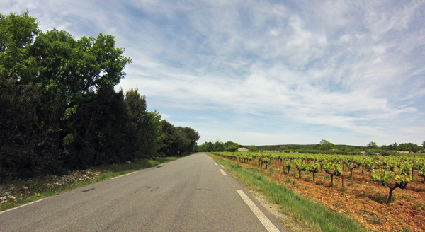 Je quitte donc la nationale à Saint Alexandre pour rejoindre Saint Paulet de Caisson et y retrouver le circuit officiel. La roue suit la vallée du Rhône au milieu des vignes et le Ventoux se donne à voir à l’est que l’on reconnaît davantage par sa masse et sa forme que par sa légendaire calotte blanche. À Saint Julien de Peyrolas, une lecture trop rapide du topo m’occasionnera une seconde variante avec un crochet par Salazac et Saint Christol de Rodières. C’est un mal pour un bien car les paysages valent le détour et Openrunner faisant foi, j’aurai ainsi augmenté le dénivelé positif de la journée de l’ordre de 300 m.