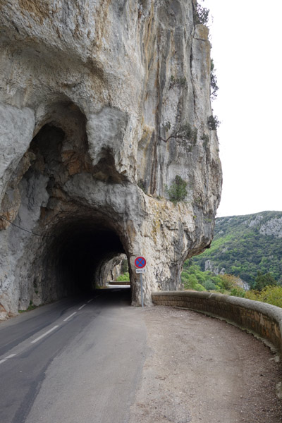 Une fois quitté la ville, la route s’enfonce rapidement dans les gorges à quelques mètres de la rivière. Elle s’en éloigne ensuite faisant une sorte d’anti-méandre qui, contournant un petit promontoire, nous place en bonne posture pour admirer le Pont d’Arc « sculpture naturelle de trente-quatre mètres de haut et cinquante-neuf de large », comme on dit dans les guides.