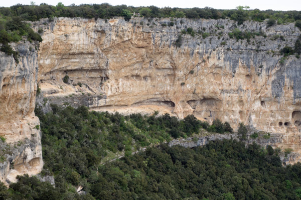 Peu après, la pente s’accentue durant deux kilomètres avec en point d’orgue le Belvédère du Serre de Tourre. C’est le premier d’une dizaine qui offrent de beaux et souvent vertigineux points de vue sur les gorges et la rivière. Méandres paresseux, parois abruptes parsemées de grottes, larges panoramas se succèdent au fil des ces haltes aménagées