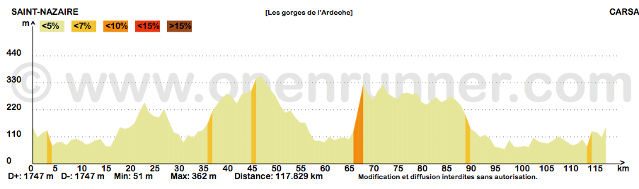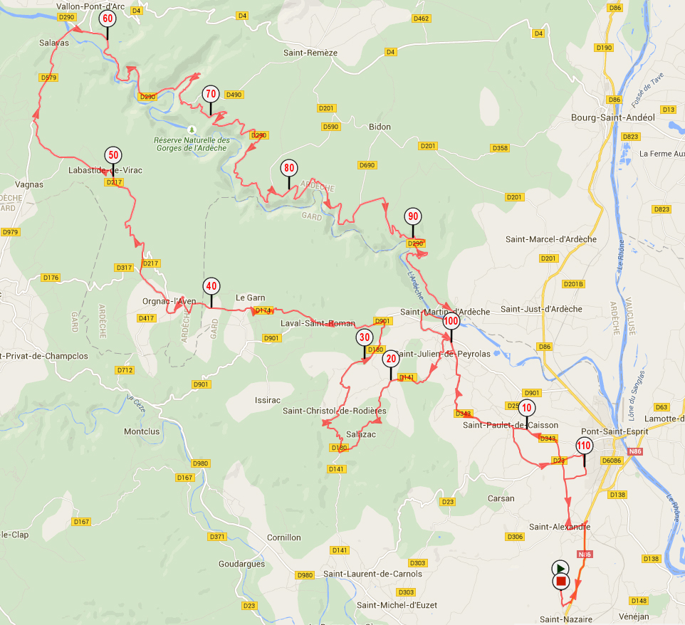 A Laval Saint Roman, la D 174 nous attend pour nous conduire vers Orgnac l’Aven par une montée régulière. De là, un second ressaut amène parmi les arbres au col de la Forestière, point culminant de cette randonnée. On bascule alors vers Labastide de Virac et son château, puis emporté par notre élan vers Salavas. On y croise enfin l’Ardèche que l’on franchit pour rejoindre Vallon-Pont-d’Arc.