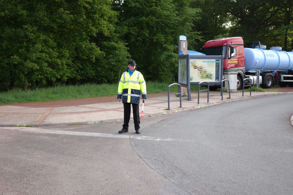 Même si cela n’apparaît pas sur la photo, les signaleurs placés à ce carrefour ont fort à faire pour canaliser le flux des arrivants et permettre aux participants d’atteindre la drève en toute sécurité.