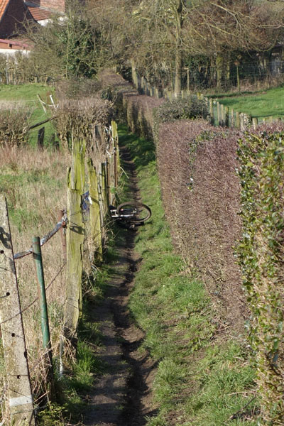 Il n’en va pas de même quelques dizaines de mètres plus loin où la pente s’accentue et la haie de droite fait place à une clôture en fil de fer barbelé. Le cycliste dont on ne voit que la roue avant s’y sera fort empêtré et malgré mon aide, aura bien du mal à s’en décrocher.
