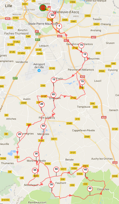 L’itinéraire proposé par le club Leo Lagrange d’Hellemmes comportait une première boucle commune aux 55 et 85 kilomètres, passant par Mons en Pévèle, une boucle supplémentaire emmenant, pour la seconde distance, vers Coutiches. La montée vers Mons en Pévèle par les Deux villes constituait la seule difficulté du parcours.