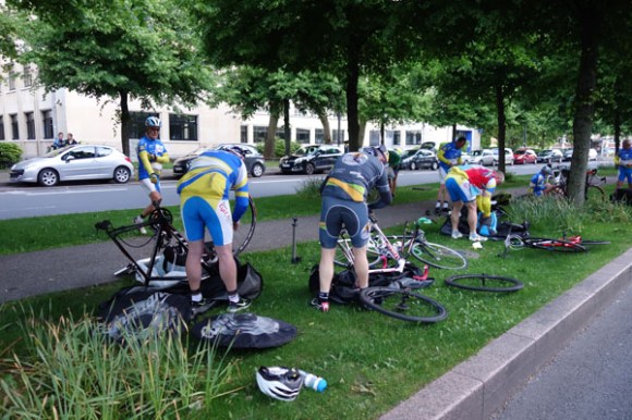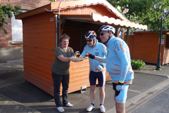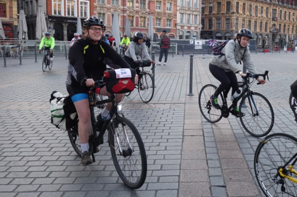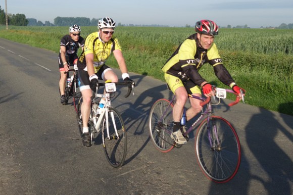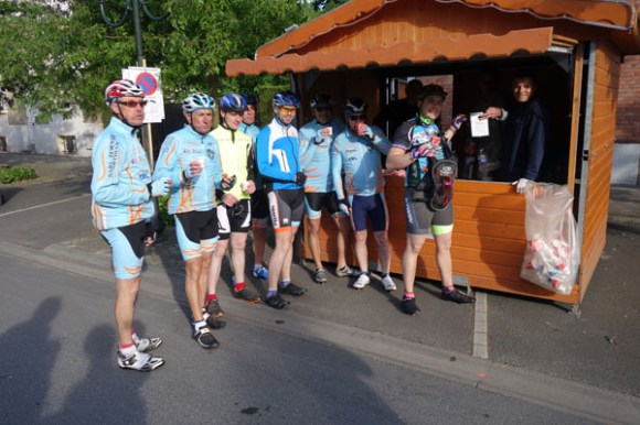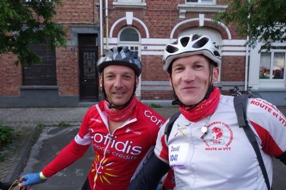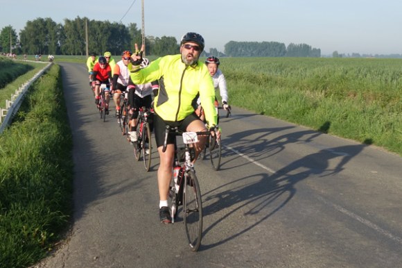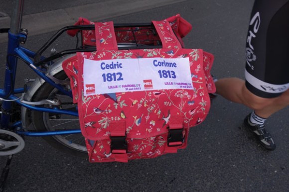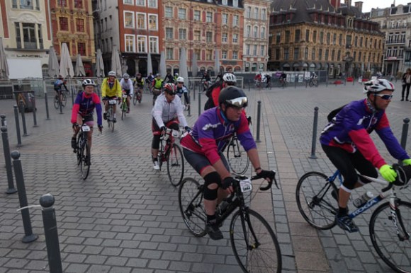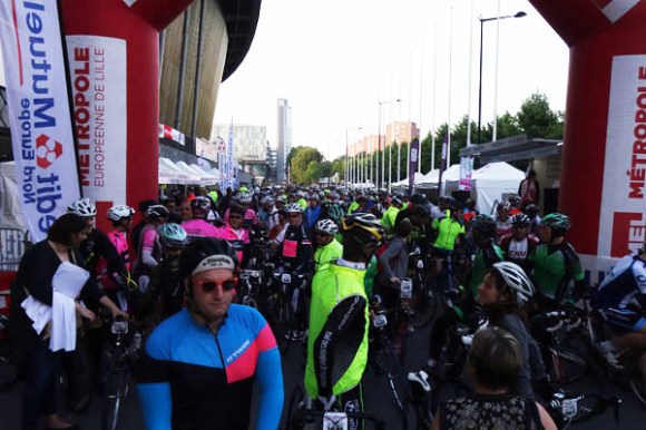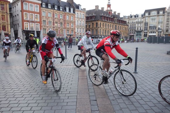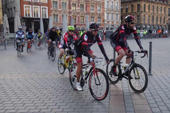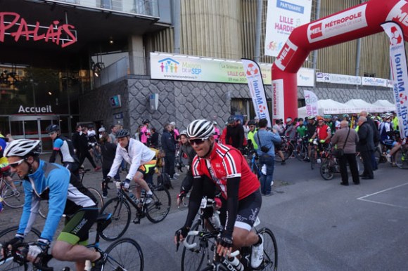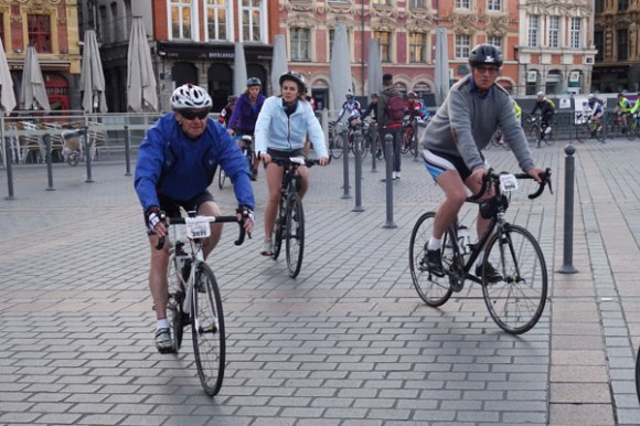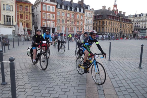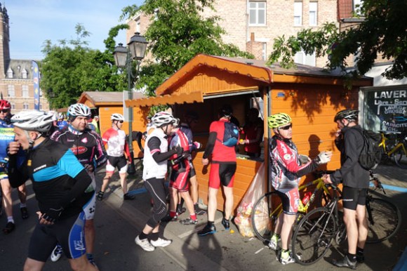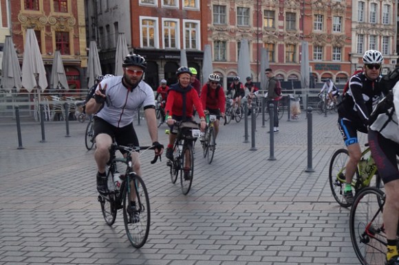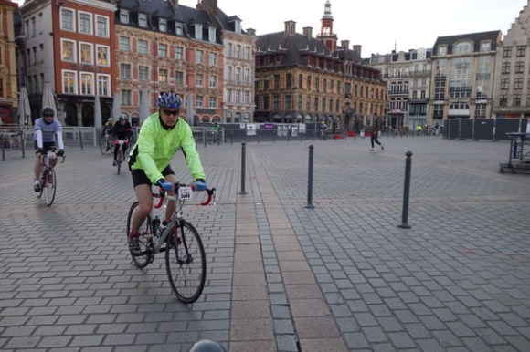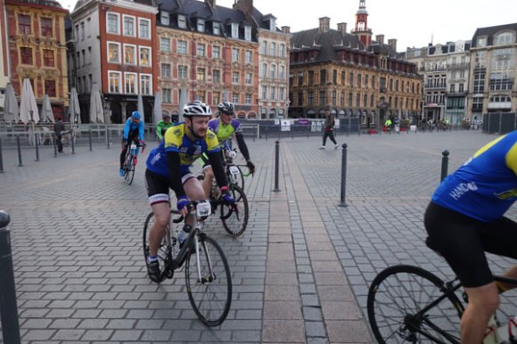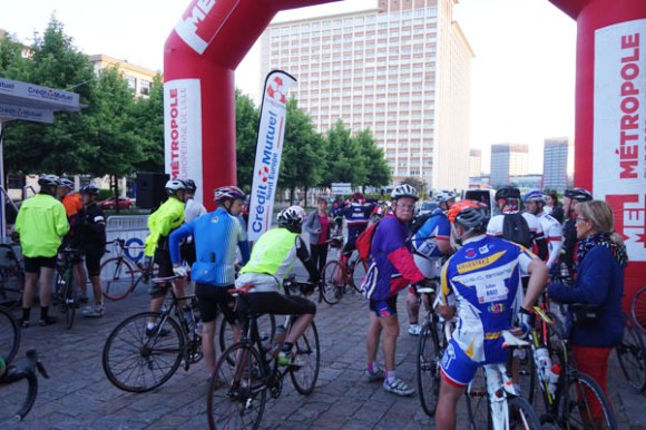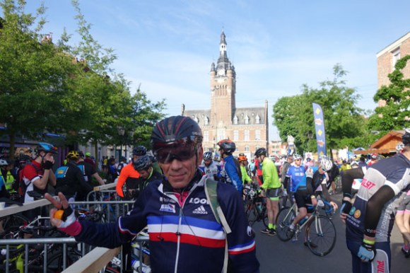 Cet accoutrement ne sera manifestement pas original. Déjà de nombreux aliens déguisés en cyclistes se pressent à 6h15 sous l’arche de départ. Les bonhommes verts de Carvin sont au rendez-vous, se faisant photographier. On est jamais mieux servi que par soi même.Dans la série photo… madame et monsieur. Les cyclistes de Saint Omer qui s’apprêtent à revenir sur leurs terres, lieu du deuxième ravitaillement. 6h16 à l’horloge de l’appareil photo… plus que 14 minutes avant le premier départ. Montage de vélos pour ceux venus en bus. Derniers ajustements. C’est ici les Geek days ? Et toujours des photos. H-3 mn Vite, vite une dernière photo. Confirmation que l’enregistreur de puces est activé, c’est parti. Lille Hardelot à la force des bras. Traversée de la Grand Place quasi déserte de tout autre type d’occupant. Encore un geek ? Heureusement le vent ne fut pas contraire. Des machines variées… Difficile, compte tenu de l’orientation du parcours, de trouver des portions où nous roulons face au soleil. Ravitaillement de Merville sur fond d’hôtel de ville. Une formule intéressante qui répartit bien les stands. Un mode de parking rustique mais qui a fait ses preuves. Monsieur, cette fois-ci sans madame. Une formule présente à tous les ravitaillement et efficace au moins pour les messieurs, je n’ai pas interrogé les dames.Animation musicale. Et toujours des photos… Ce n’est pas Cedric et Corinne mais David et un coéquipier…