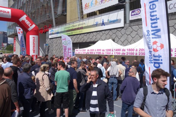 C’est sous un beau ciel pommelé que se déroulent les inscriptions. Le vent  qui en ce bel après-midi fait fort joliment battre les oriflammes… … pourrait demain être moins plaisant. Les numéros de plaques qui s’affichent sont au fil des ans de plus en plus impressionnants. Fruit du hasard, l’accueil des 3000 premiers inscrits génère de longues files d’attente… … alors que celui des 3000 suivants est facilement accessible ? Ou alors les premiers inscrits sont-ils tout aussi prévoyants dans le retrait de leur dossard, les autres faisant davantage preuve de nonchalance. Entre musiciens et cyclistes, les couleurs s’accordent. Peut-être encore un peu jeune pour Lille Hardelot. Mais voilà de drôles de paroissiens… … qui suscitent des regards circonspects. Les aliens sont partout. L’explication est vite trouvée avec, qui jouxte les stands de Lille Hardelot, un salon dédié à l’univers des jeux vidéo et autres récits de science-fiction.Cet étrange créature… … aurait sans doute un peu de mal à pédaler. La belle et la bête version « Comics ». Bon, bon, moi je reviens demain déguisé en cycliste pour le départ.