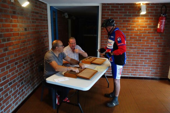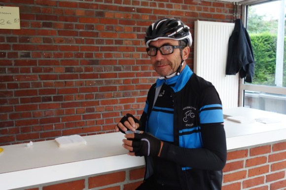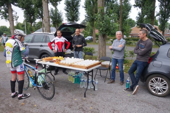 Distribution de porte-clés au départ. Un cyclo de la Roue Quesnoysienne arrivé en avance, je croiserai certains de ses coéquipiers peu après le départ. Le menu du jour. Serge, 83 ans, mais qui finalement n’est pas le doyen du jour. Pierre du CC Lesquin qui fêtera ses 85 printemps en août était aussi de la partie. Si pierre qui roule n’amasse pas mousse, celui-ci a du accumuler pas mal de kilomètres. Le ravitaillement de Steenwerck. Première ascension avec le Mont de Lille. On tourne à gauche et on monte.   Deuxième ravitaillement. Il fut question du prochain brevet de Bois-Grenier. Amateurs de bosses, optez plutôt pour le 85 km, plus intense que le 100 km (pour revoir l’édition 2016).  Premesques n’est plus qu’à quelques coups de pédales, le vent est favorable et il ne pleut pas encore, que du bonheur. Si vous voulez refaire ce circuit. Suivez le « P » rose, ou…