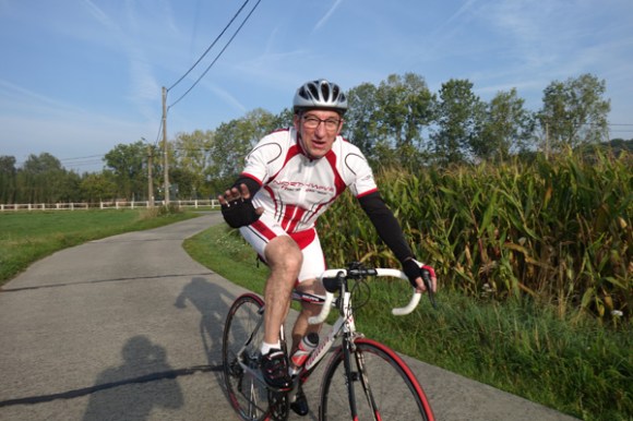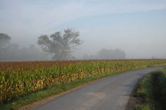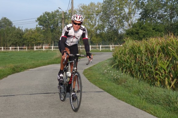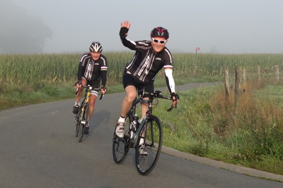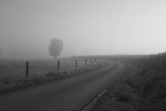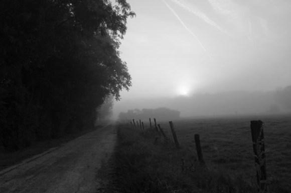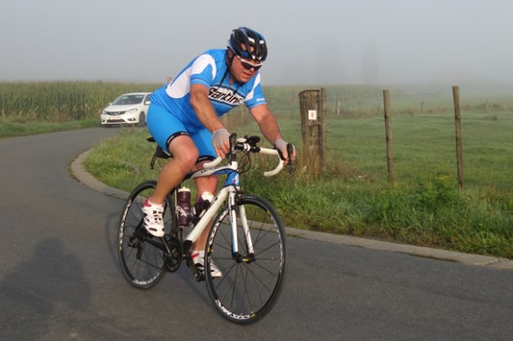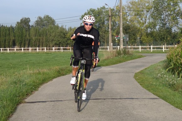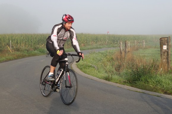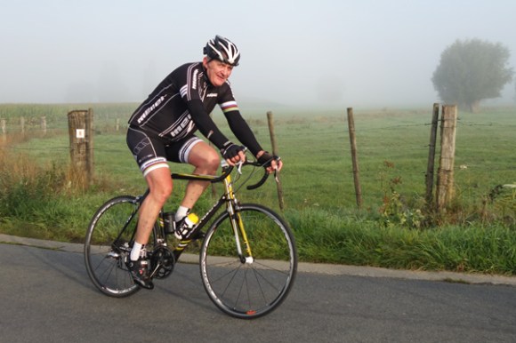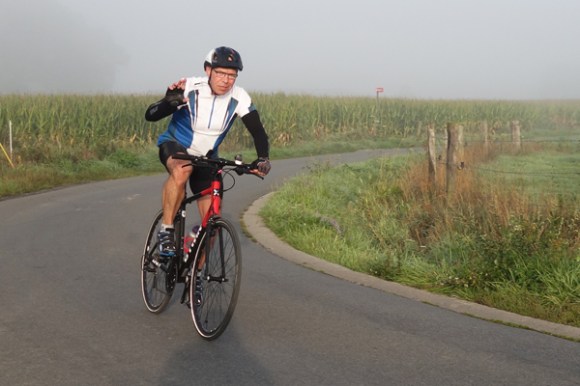 Il vallait mieux bien se couvrir ce dimanche matin car à la fraicheur de l’air s’ajoutait l’humidité d’un brouillard parfois dense en campagne. Très présent durant les premiers kilomètres, j’atteignis le centre de Messines sans même avoir aperçu l’église dont une éclaircie découvrit soudain le clocher. Difficile également de percevoir visuellement le dénivelé que seule la nécessité de changer de développement laissait deviner.