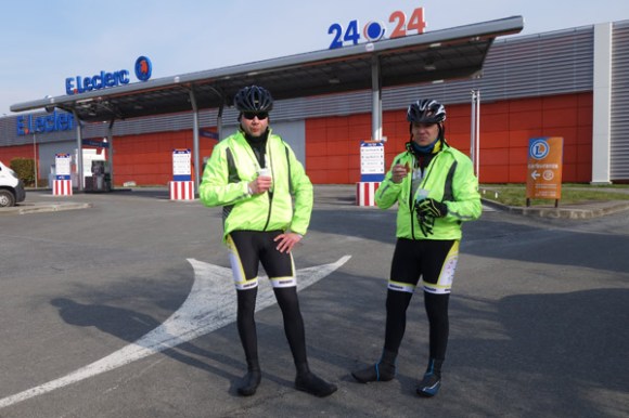 Deux cyclistes qui font le plein… mais pas d’essence. Simple voisinage du poste de ravitaillement.