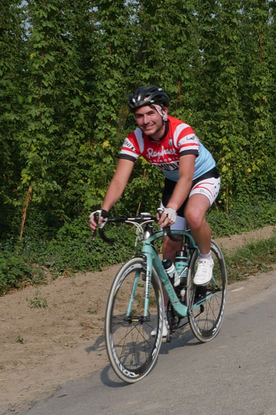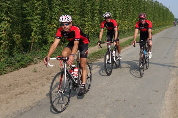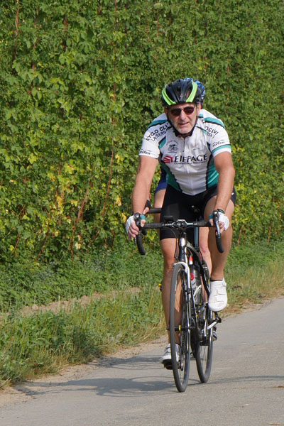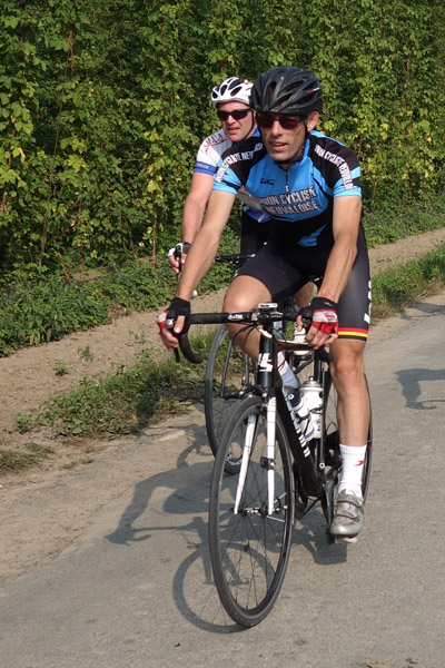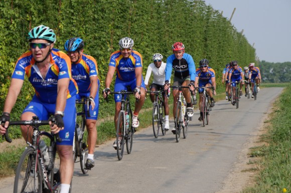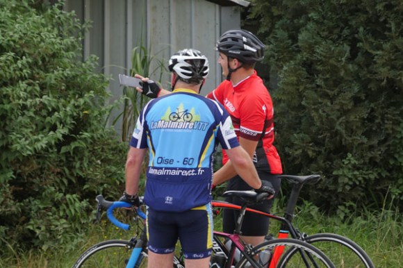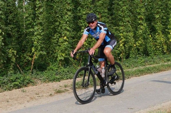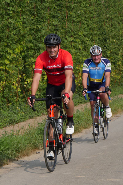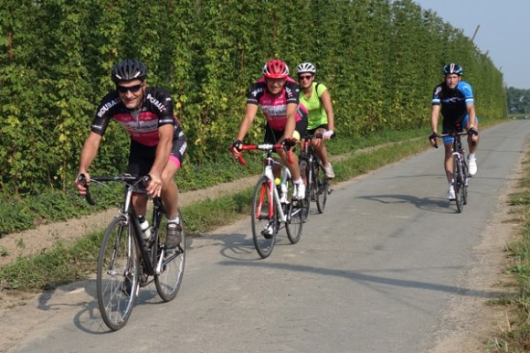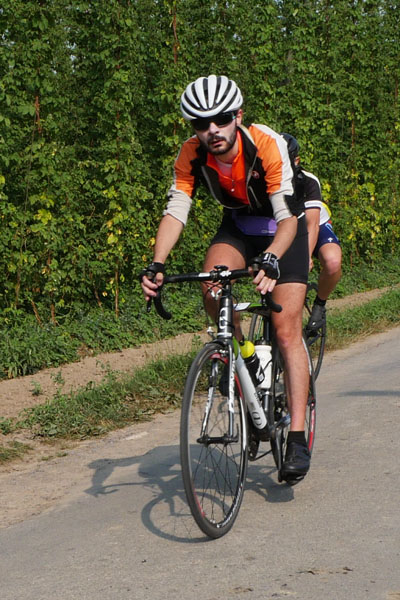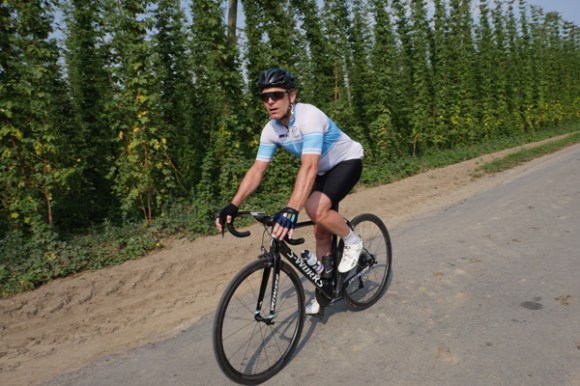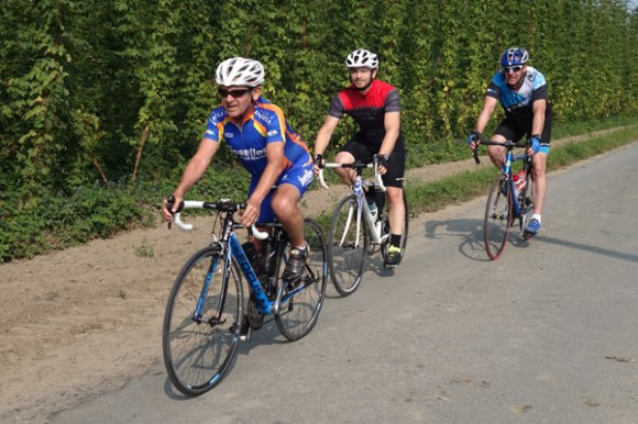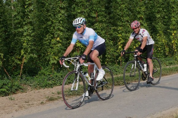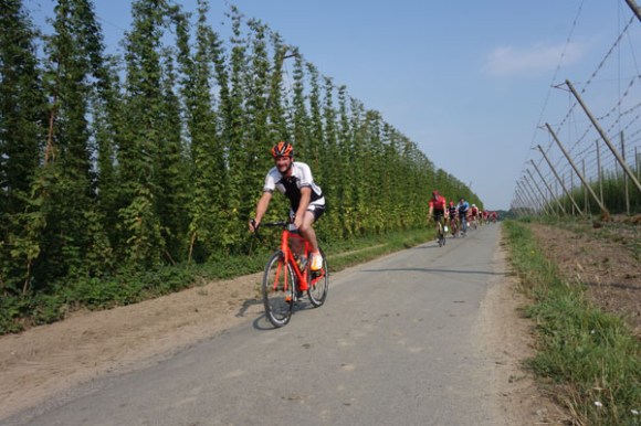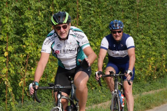 Les deux cyclistes dont l’un au moins n’est pas du coin à en croire son maillot, trouvent le paysage si pittoresque qu’ils se photographient avec les champs de houblon en arrière plan.
