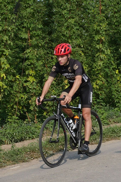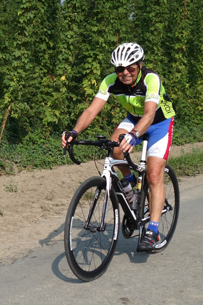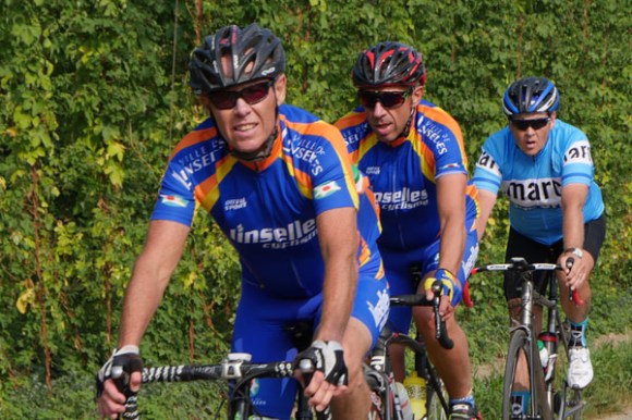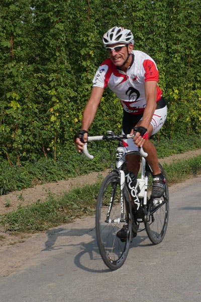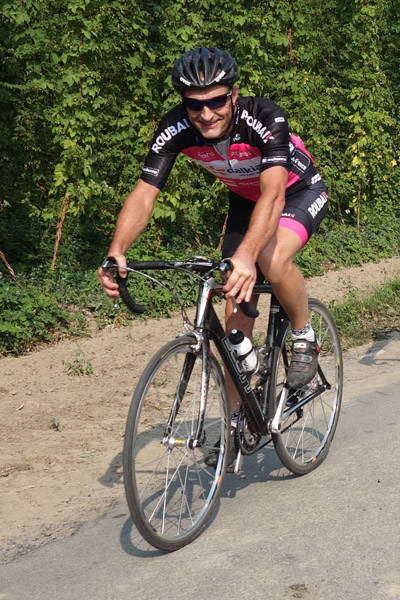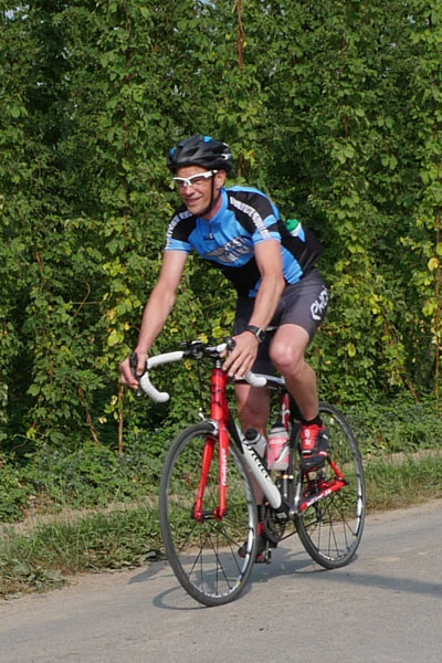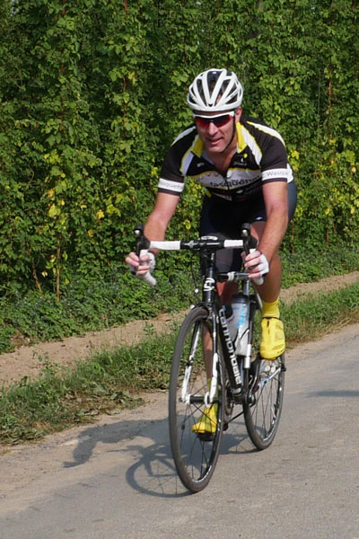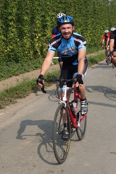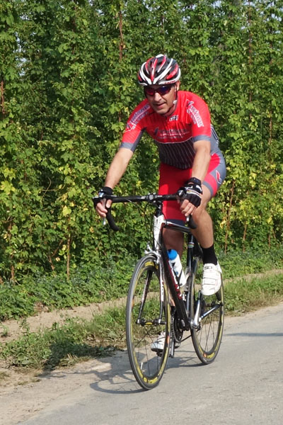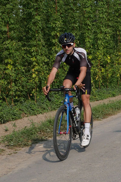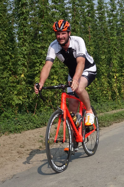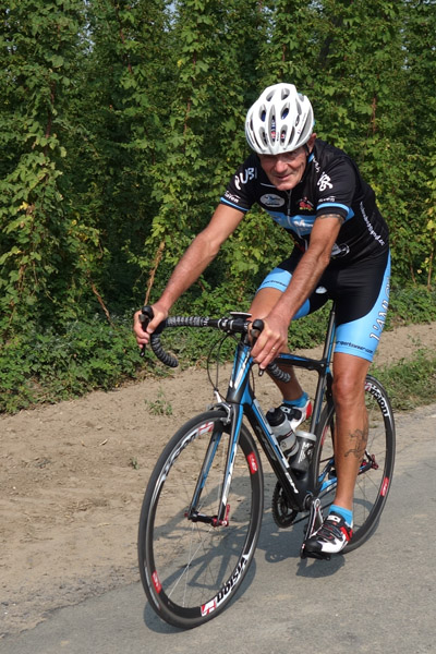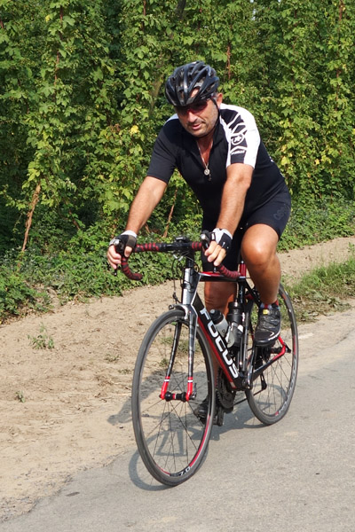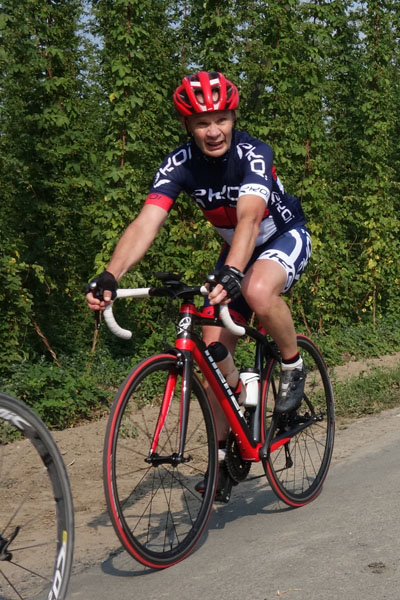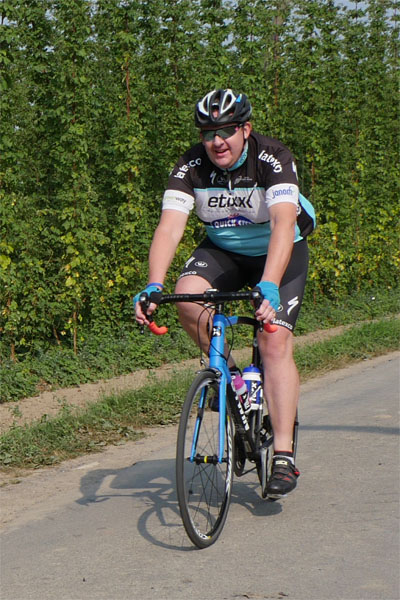 Les deux cyclistes dont l’un au moins n’est pas du coin à en croire son maillot, trouvent le paysage si pittoresque qu’ils se photographient avec les champs de houblon en arrière plan.