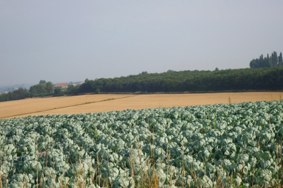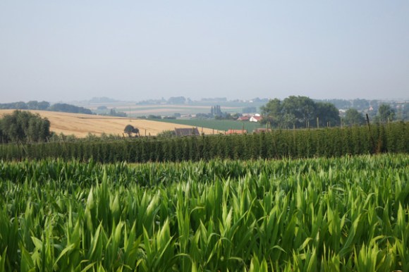 Maïs et houblon contrastent avec la blondeur des champs de céréales pour beaucoup déjà moissonnés.