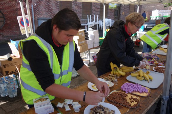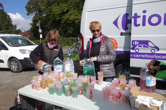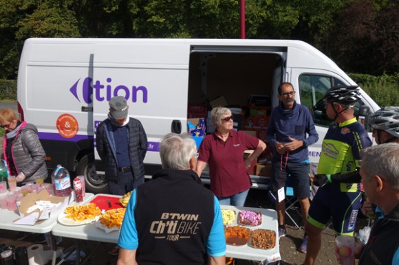 Premier passage au ravitaillement de Boeschepe. Presque la célébrité. Consignes pour les ravitailleurs. Heures de passages attendues et orientation, ce ravitaillement étant commun à deux circuits avec un second passage pour le 126 km. Bon point pour l’organisation, l’utilisation de gobelets lavables. A reproduire dans les autres brevets. Ravitaillements variés et copieux. Ce n’est pas tous les jours que le géant est de sortie. Cela mérite une photo. En route vers le Mont des Recollets avec le vent de face. Ce n’était pas la partie la plus facile. La montée de Cassel avec le sourire. Pas très sûr que ces deux photos suivent la chronologie. Ravitaillement de Sainte Marie Cappel. D’ici peu, Route et Défi des Monts se sépareront. Panorama connu mais apprécié vu haut du Mont des Cats. Entre Boeschepe et le Mont Rouge. Facétie du réglage d’exposition, mieux vaut passer en noir et blanc.