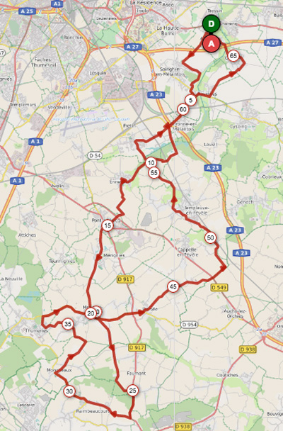 L’itinéraire, classique, formait pour le 50 kilomètres une boucle dont Mons en Pévèle marquait le point de retour, le 70 kilomètres prolongeant le parcours d’une boucle nous y ramenant, franchissant ainsi deux fois l’éminence pévéloise.