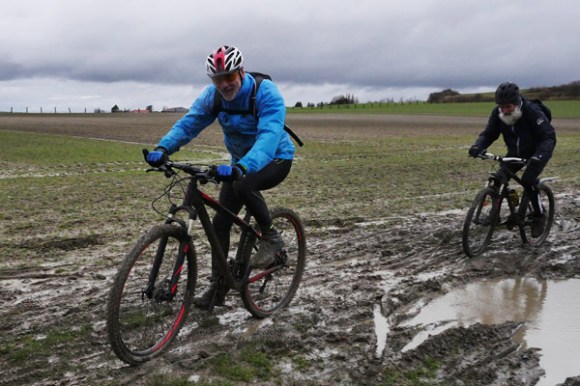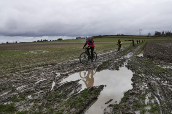 Une première série se situe à la fin d’un chemin étroit conduisant à Mons en Pèvèle. Sans en avoir l’air c’était une vraie patinoire. Une seconde suit de peu le ravitaillement avec le seul passage vraiment boueux au pied de Mons en Pévèle. La sortie du terril de Thumeries sera l’occasion de m’exercer avec un bonheur variable à la prise de vue en filé.