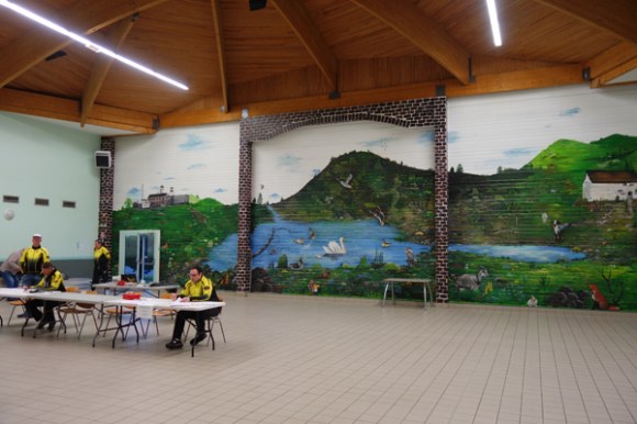 A 7h30 la salle est encore vide, ce qui permet d’admirer la peinture murale qui l’orne.