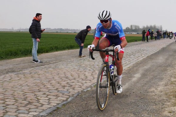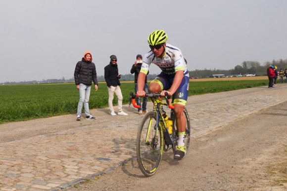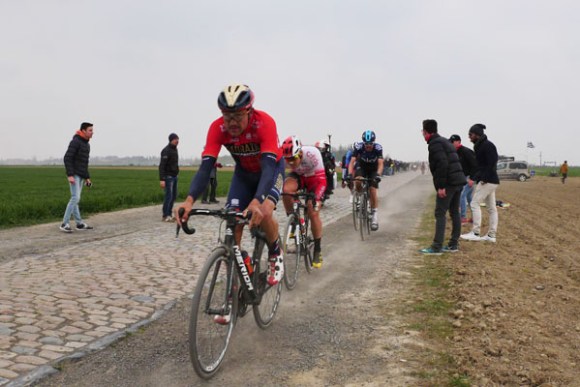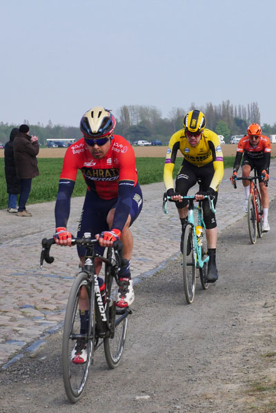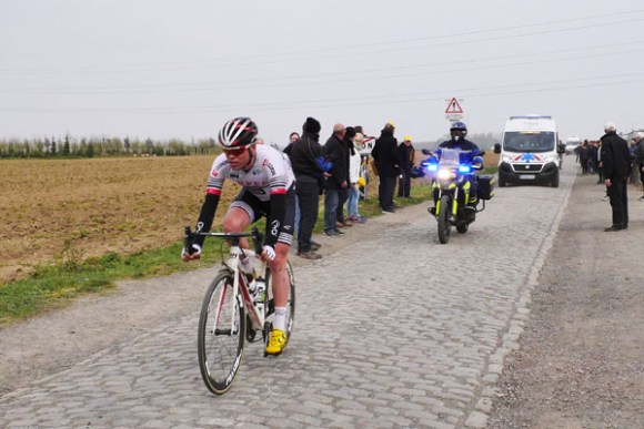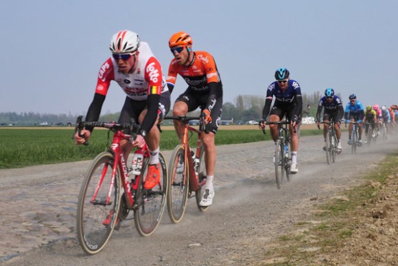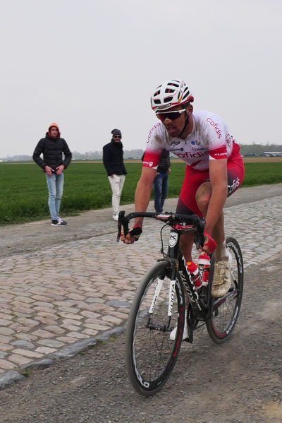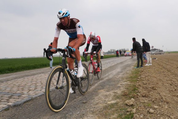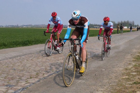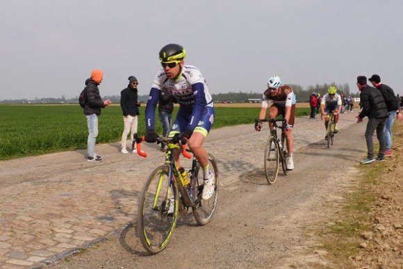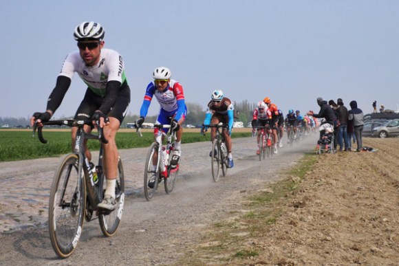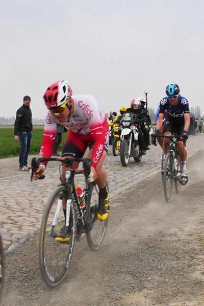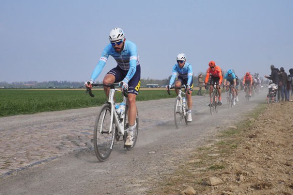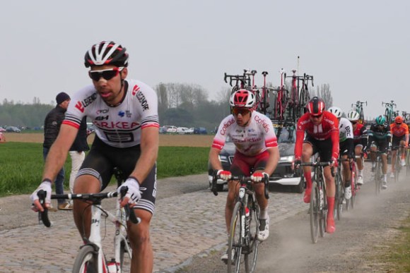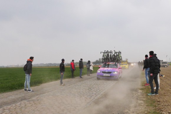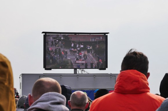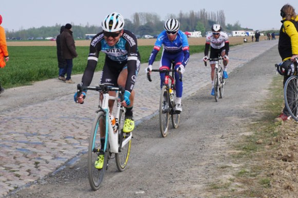Fin du secteur pavé de Gruson. Un dernier secteur attend les coureurs, si l’on excepte le minuscule tronçon précédent le vélodrome.