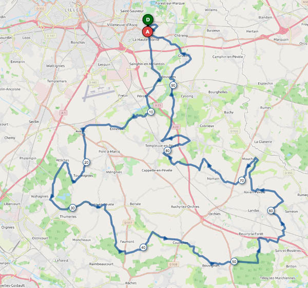 Le parcours, bien roulant, traversait Mélantois et Pévèle par des routes champêtres. Vous pouvez le retrouver en suivant les étoiles oranges au départ de la rue Delattre et aussi sur Openrunner