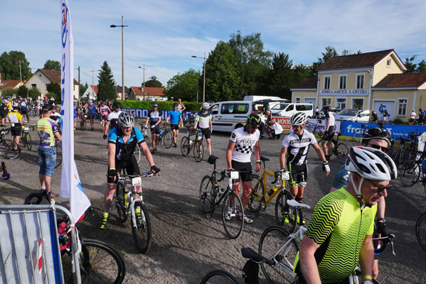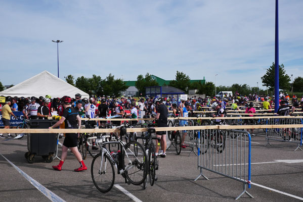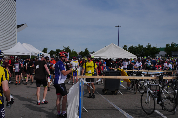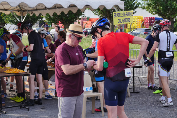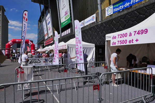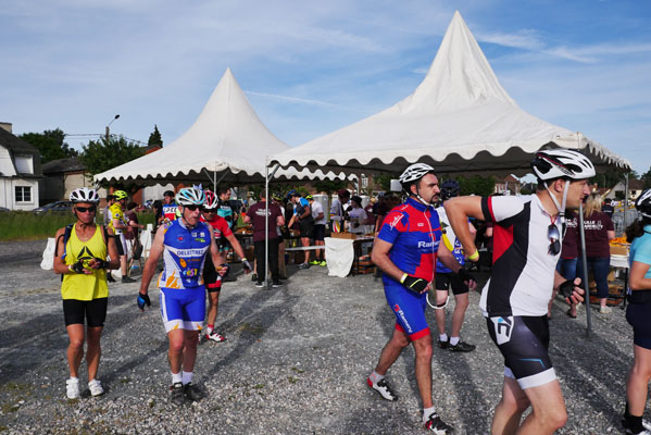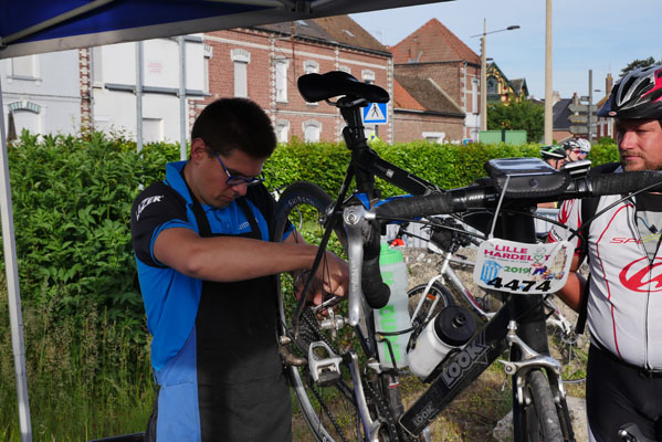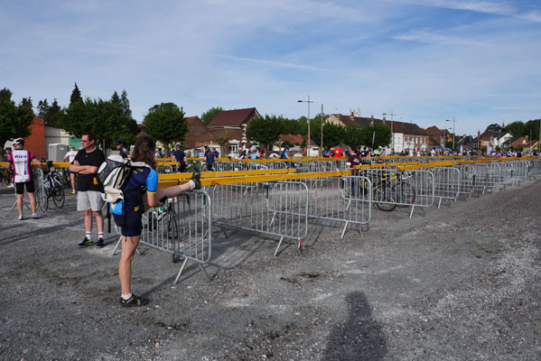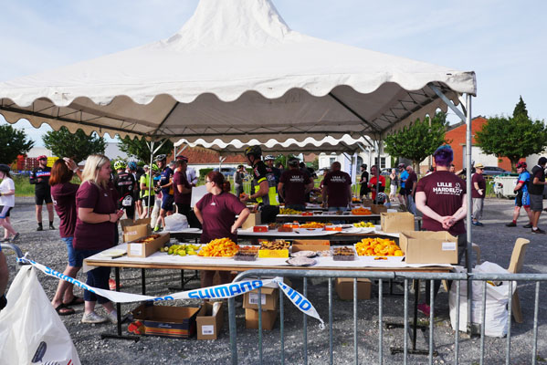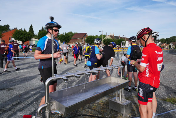 Le ravitaillement d’Aire sur la Lys que j’avais connu sur la Grand Place, lors de ma dernière participation en 2017, était localisé de façon plus adaptée sur un terre plein à l’entrée de la ville. Parc à vélo spacieux, stands de ravitaillement en épi, points d’eau pour le remplissage des bidons, sanitaires en nombre garantirent la fluidité et le confort. Il en fut de même à Lumbres.