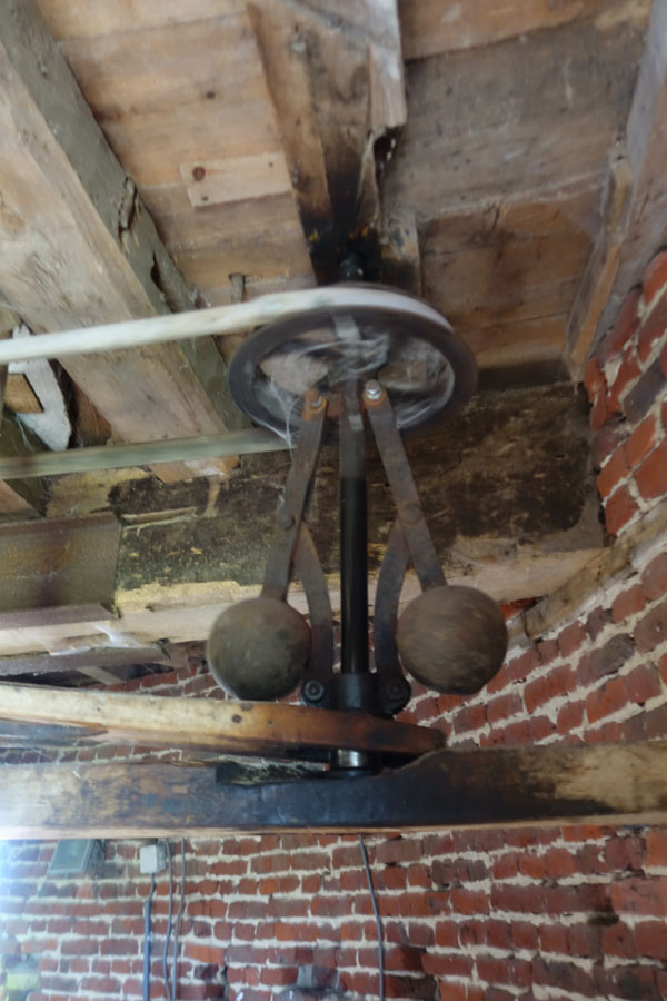 Système de régulation. La vitesse de rotation provoque l’écartement des boules et corrélativement permet au levier en bois de monter.