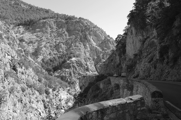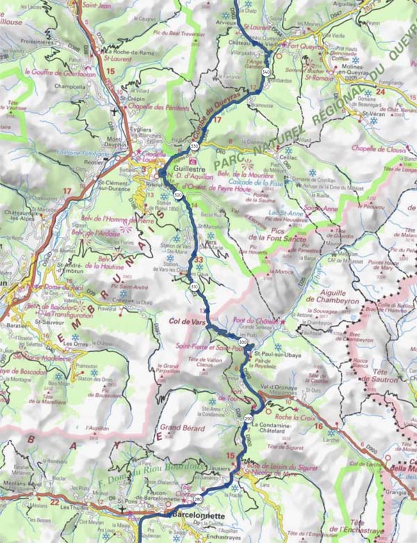 Parvenu au col je m’installe sur une bosse ensoleillée et casse la croute en regardant arriver les premiers grimpeurs venant principalement de Guillestre. J’entame la descente et négligeant Guillestre connu comme Barcelonnette de vieille date, je file directement vers Château Queyras suivant les gorges du Guil.