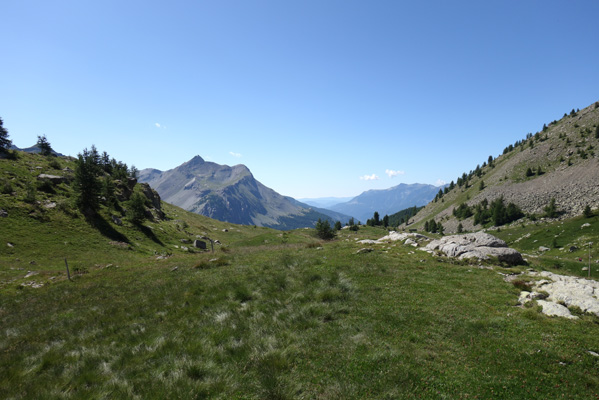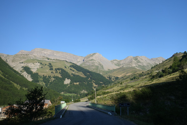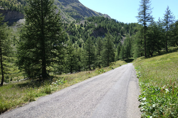 Je démarre à 7h00 alors que le soleil n’a pas encore franchi les crêtes des monts qui bordent la vallée de l’Ubaye bénéficiant ainsi d’une ombre rafraichissante. Jusque Saint Paul en Ubaye la pente est modérée, puis à partir de là elle se relève. Le col est indiqué à 6,8km.