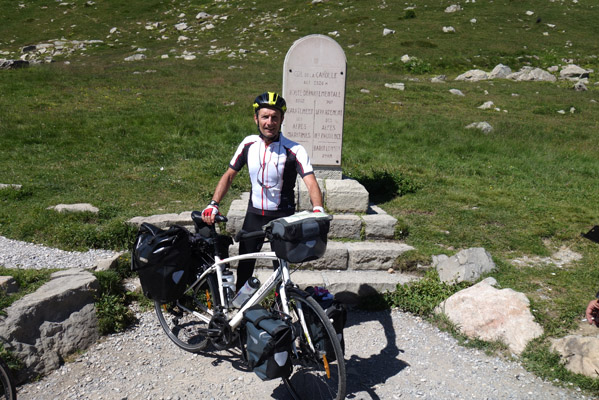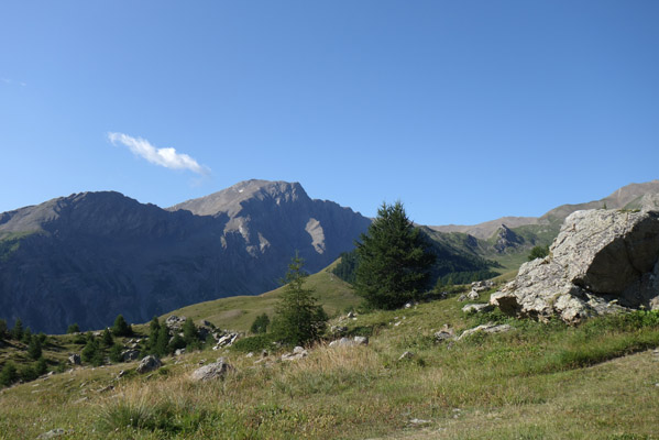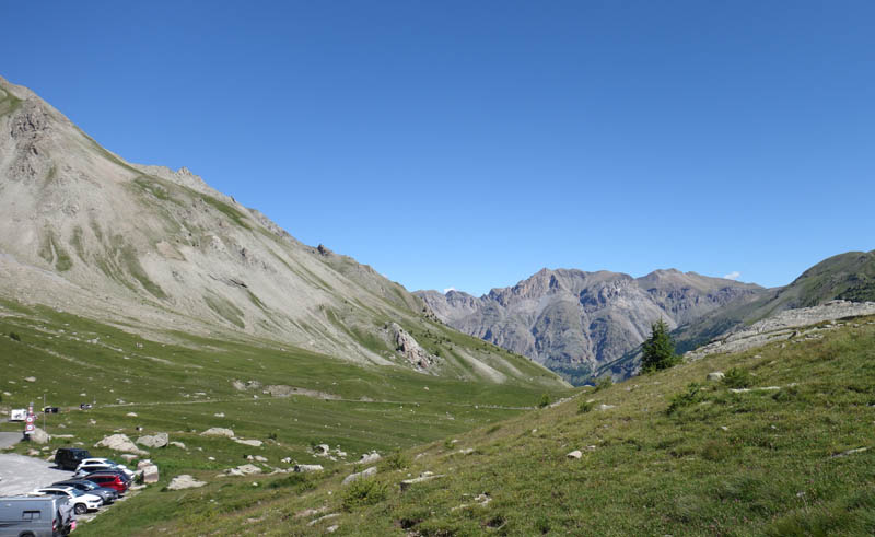 Faut-il y voir un acte manqué, je n’ai pas de trace écrite de cette première « grande étape de montagne » avec le franchissement du col de la Cayolle. Je garde le souvenir d’une montée régulière qui se durcit à partir d’Entraunes mais sans excès. Le col est encore peu fréquenté quand j’y parviens mais suffisamment pour que quelqu’un me prenne en photo devant le panneau indicateur, photo que je m’empresse d’envoyer à ma femme pour la rassurer.