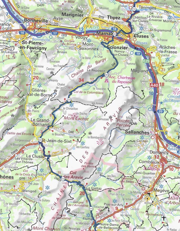 La carte des circuits vélo de la Savoie, disponible dans les offices de tourisme est suffisamment précise pour me guider sur ce tronçon qui ne figure pas sur les extraits de cartes que j’ai imprimés. Je décide donc, passé le col des Aravis, de descendre vers le Grand Bornand, puis de franchir le Col de la Colombiere.